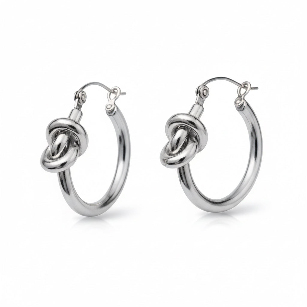 The Tie the Knot Hoops feature a sleek, polished silhouette accented with a sculpted knot detail that adds dimension without overwhelming the look. Clean and modern, these earrings strike the balance between minimal and statement.